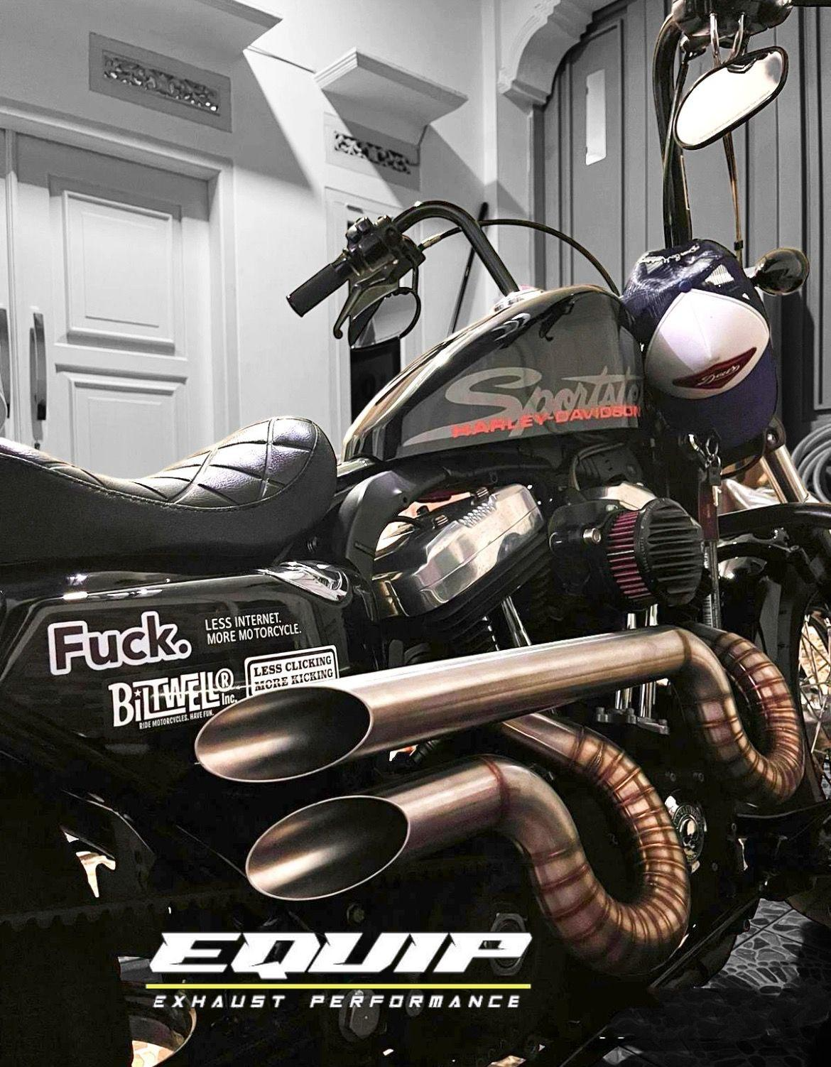 Our EQUIP EXHAUST PERFORMANCE exhausts have a great deep, throaty tone that are much louder than the stock exhaust. As far as volume goes, we rate them a 10 on a 1-10 scale as they are just slightly quieter than straight pipes. EQUIP EXHAUST PERFORMANCE exhausts are as awesome looking as they are sounding, always giving your Sportster that aggressive look. EQUIP EXHAUST PERFORMANCE exhausts are designed to be easily installed by yourself and can put on and ready to go in about 30 minutes – including taking off your factory pipes using only a few simple tools. EQUIP EXHAUST PERFORMANCE exhausts require no additional hardware for installation and use your factory pipe clamps.